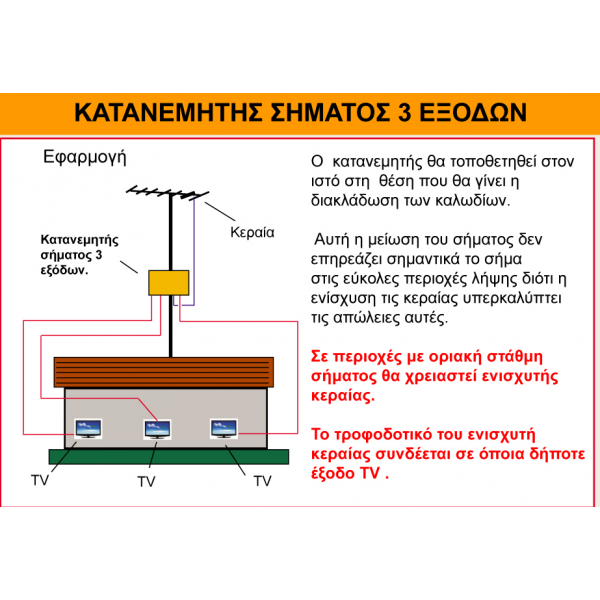 Ο διακλαδωτήρας 3 παροχών δέχεται διέλευση θετικής τάσης από όποια δήποτε έξοδο μόνο προς την είσοδο, όχι μεταξύ των εξόδων TV1, TV2 ή TV3.
